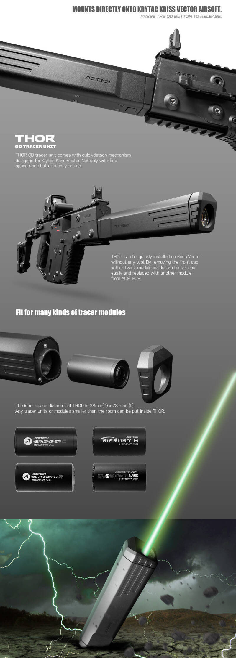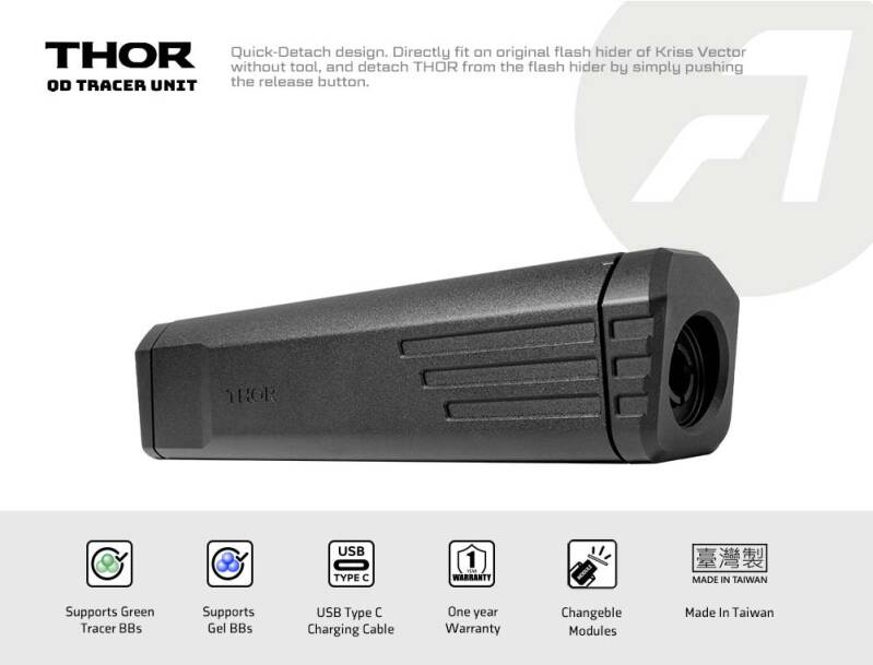 THOR QD Tracer comes with quick-detach mechanism designed for Krytac Kriss Vector. Not only with fine appearance but also easy to use, THOR can be quickly installed on Kriss Vector without any tool. By removing the front cap with a twist, module inside can be take out easily and replaced with another module from ACETECH.