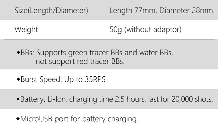 Compact and weighs only 32 grams, easy to carry and occupying no space. It can be used as a tracer module, and put into silencer. Built-in lithium battery, supplies up to 20,000 luminous bullet shots per charge. Supports 35PRS burst speed, brighter than ordinary tracers Made in Taiwan, FCC, CE and ROHS certified.